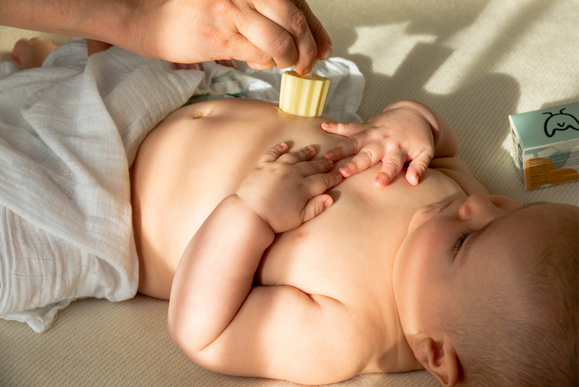 Die Halterung des Massage Sticks besteht aus dem veganen Carnaubawachs und schafft eine angenehme Möglichkeit die Baby Massage durchzuführen ohne die Hände dabei zu befetten.